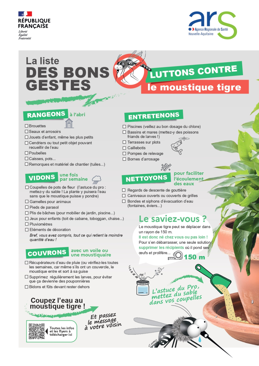 Ces gestes simples, réalisés régulièrement, permettent de supprimer les gîtes larvaires, lieux indispensables à la reproduction du moustique tigre.
