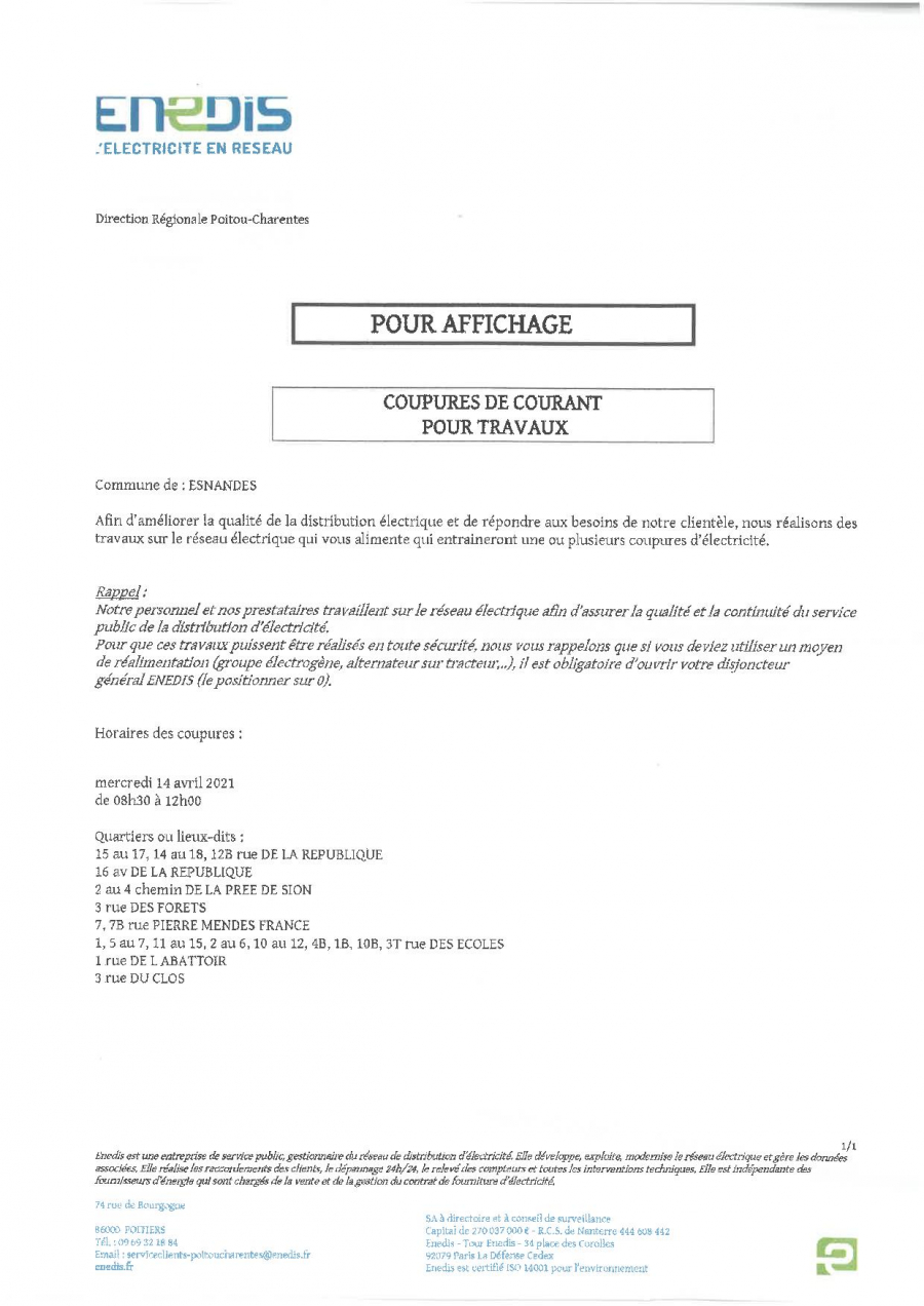 Consciente de la gêne occasionnée par ces travaux, l’entreprise ENEDIS vous remercie de votre compréhension.