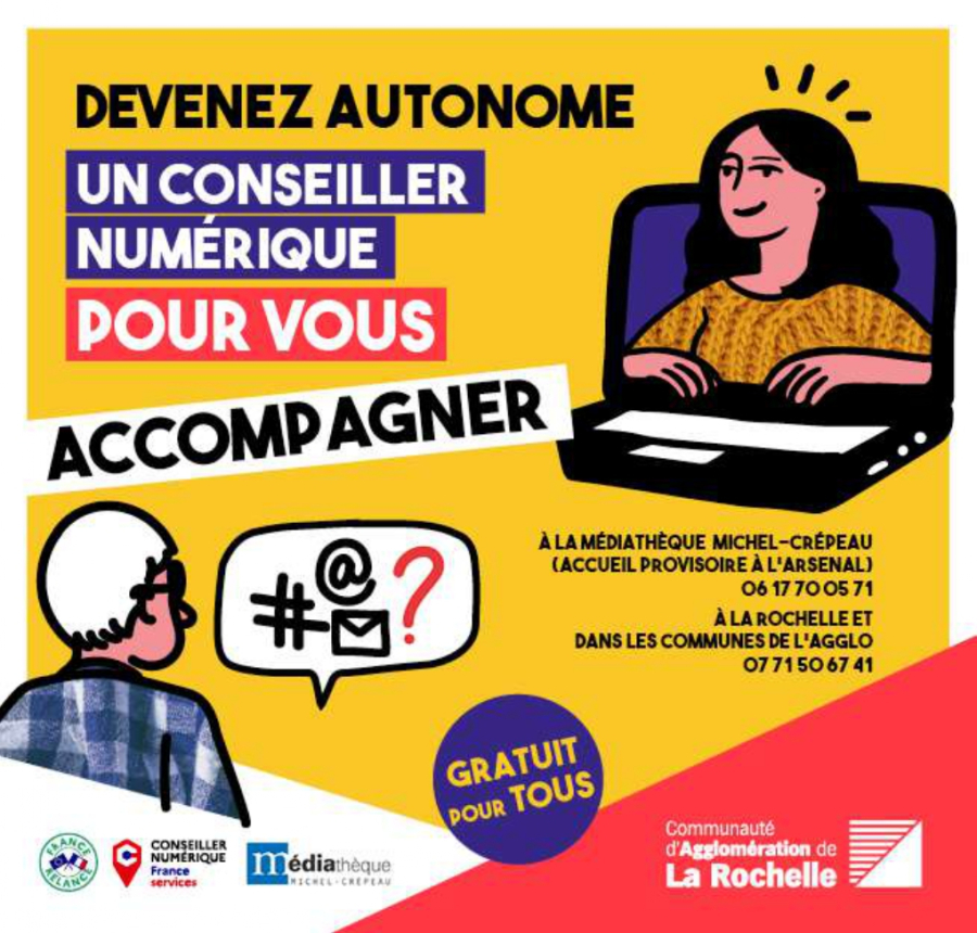 • Un Conseiller numérique travaille ainsi en itinérance dans les communes de l’Agglomération et les quartiers de La Rochelle. Vous pouvez le contacter au 07 71 50 67 41 pour prendre rendez-vous.
